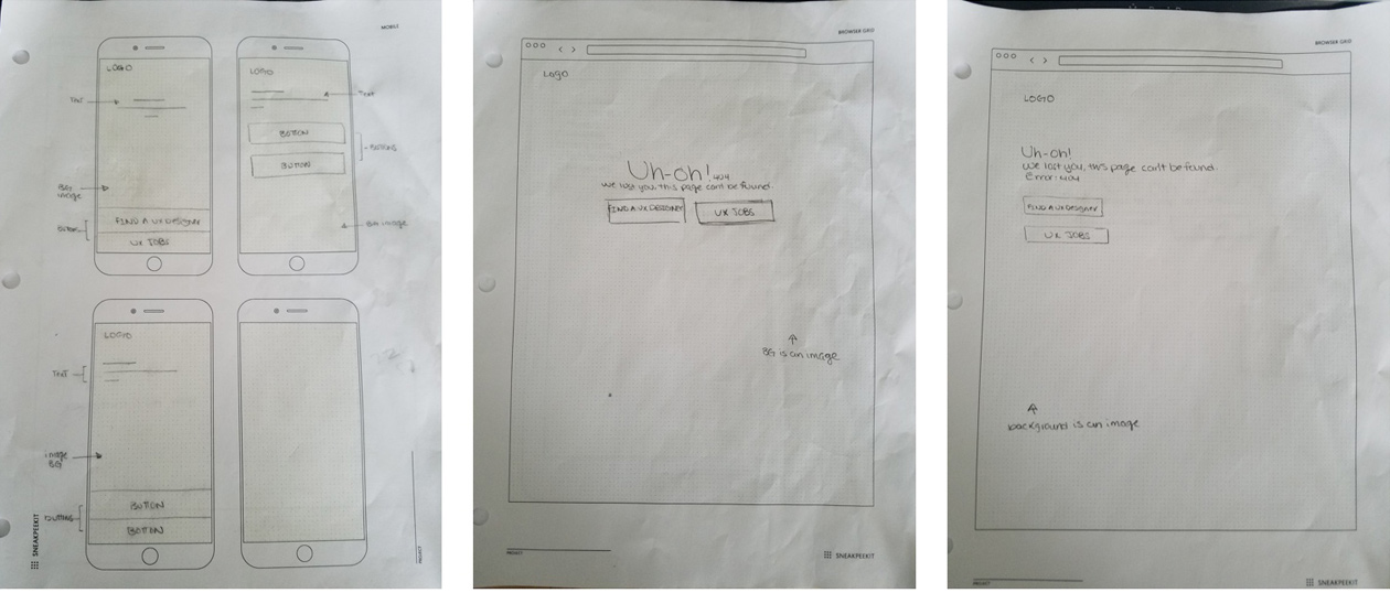 Because of the potential frustration experience a user will have when accessing an incorrect or broken link, I thought of keeping things simple and straight forward. I sketch out low-fidelity wireframes for possible concepts, then high-fidelity wireframes to continue to show the process.