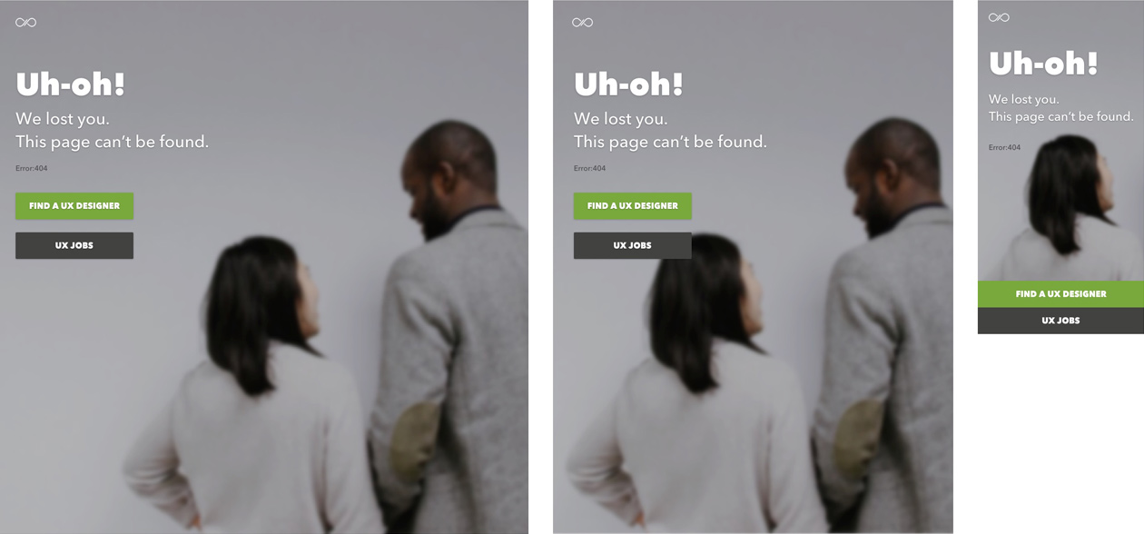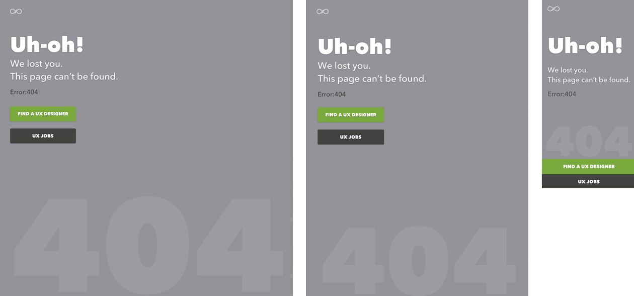 Based on the feedback, I considered adding navigation to my concept designs. But I researched uxhire.com (mobile & desktop) again for that specific request and came to find out they don't have navigation for mobile-only, so I kept my current designs. Come to think of it, another potential frustration I saw in my layout was a background image. I removed the background image and only used a background color instead. I visually added the "404" text at the bottom just in case the error message was still too small.