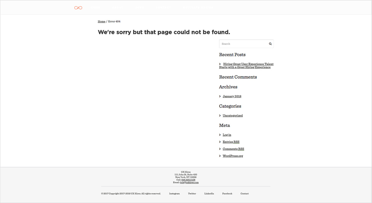 Redesign UXHires.com 404 Error Page for desktop & mobile. They are looking to improve a potentially frustrating experience when a user tries to access an incorrect or broken link.